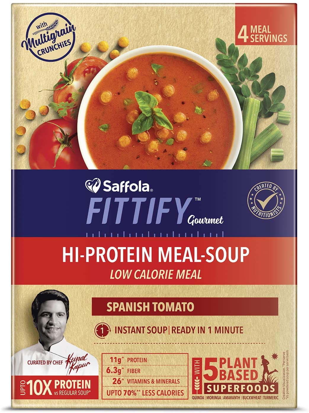 Saffola FITTIFY Gourmet HI PROTEIN SLIM MEAL-SOUP is a delicious meal scientifically created by nutritionists & curated by chef Kunal Kapur in exotic flavours from across the world. ... Compared to regular soups it has 10X protein, 6X fiber & 26 vitamins & minerals to give you nutrition like a meal.
